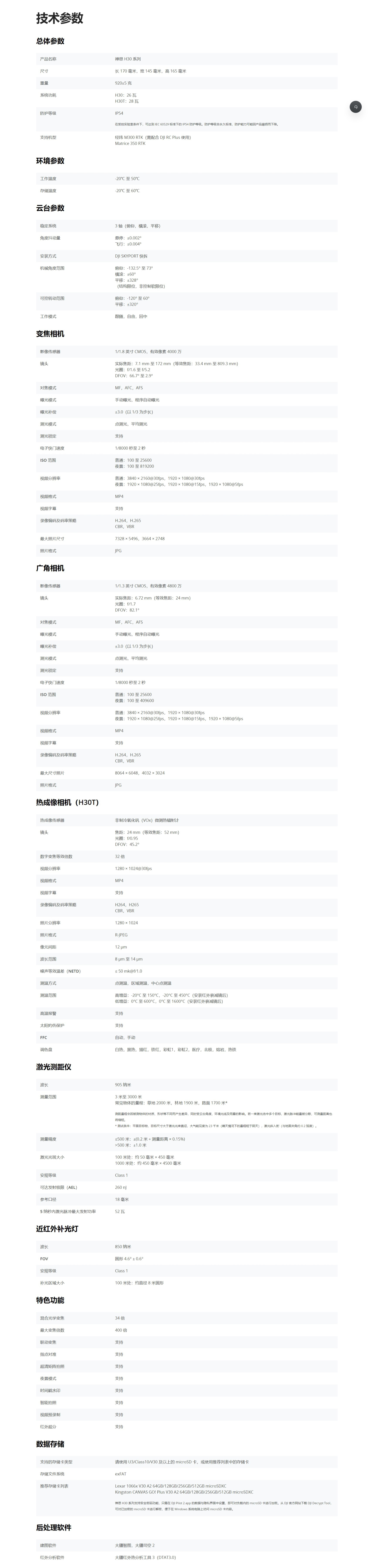 全天候多光旗舰负载禅思 H30 系列,,集成广角相机、、、变焦相机、、、、热成像相机、、、、激光测距仪和近红外补光五大模组,,,并应用前沿智能算法,,,全面提升感知与成像能力,,突破昼夜视觉局限,,,轻松胜任公共安全、、、、能源巡检、、、水利林业等领域的作业任务。。。。